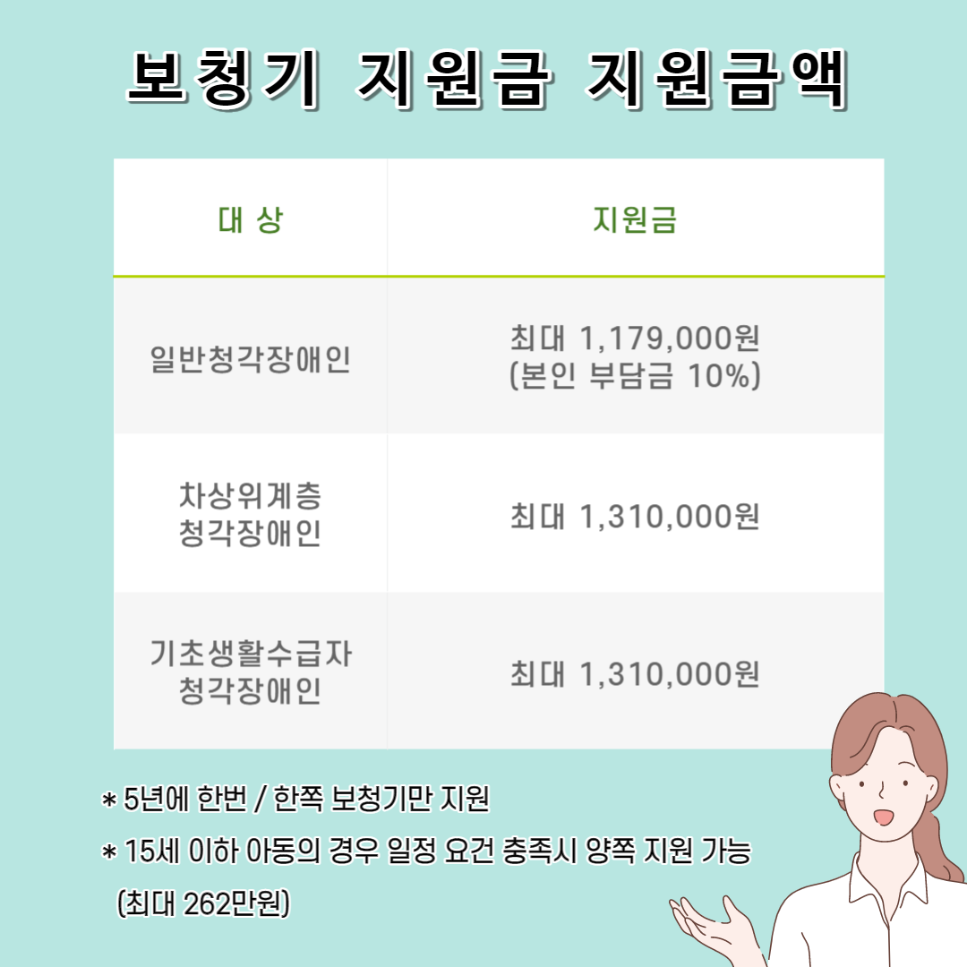보청기 보조금은 청각 장애로 등록 된 사람들이 보청기를 구매할 때 경제적 부담을 줄이는 데 도움이되는 시스템입니다. Health Insurance Corporation에서 운영하며 특정 요구 사항을 충족하면 보조금을받을 수 있습니다. 상대방이 80dB (2) 이상인 경우 장애인 등록에 필요한 청각 장애인으로 등록되지 않은 경우 보청기 보조금을받을 수 없습니다. 목표에 포함 된 성인은 보청기 모두에 대해 하나의 보청기 만 지원할 수 있습니다. (긍정적 인 지원 조건)*보조금 지원 조건 1) 양 귀의 청력 손실 80dB 미만 지원하다.
